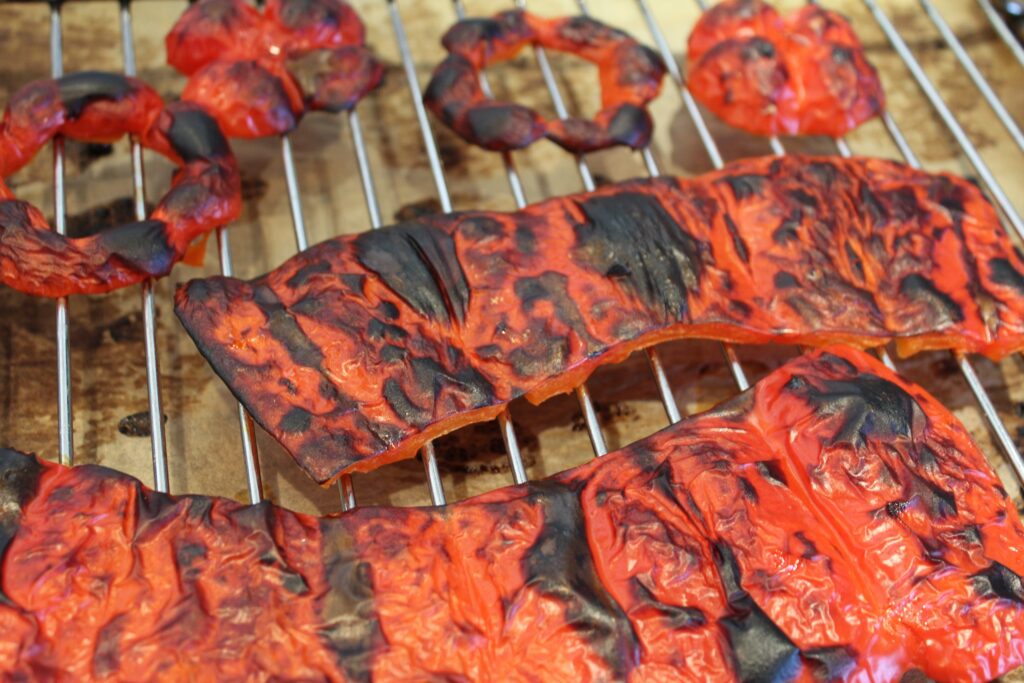 - Start med at grille de røde peberfrugter. Tænd ovnen på grillfunktion.Det er ikke lykkes mig at finde færdiglavede i handlen (har ikke ledt særlig ihærdigt 🙂 ), så jeg laver dem altid selv.Rens peberfrugterne, skær dem op og befri dem for frø. Læg dem på en bagerist. Sæt en plade med bagepapir under og sæt dem i ovnen under grillen. Grill 8-15minutter til de er blevet godt grillede, og skindet er blevet sort.