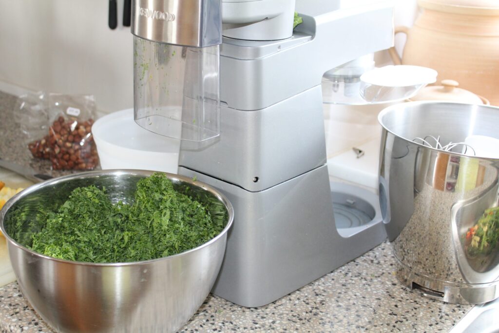 - Skyl grønkål og rib bladene (ribberne kan evt. bruges i juiceren). Skær grønkålen fint enten med en kniv eller med snittejern i en foodprocessor.