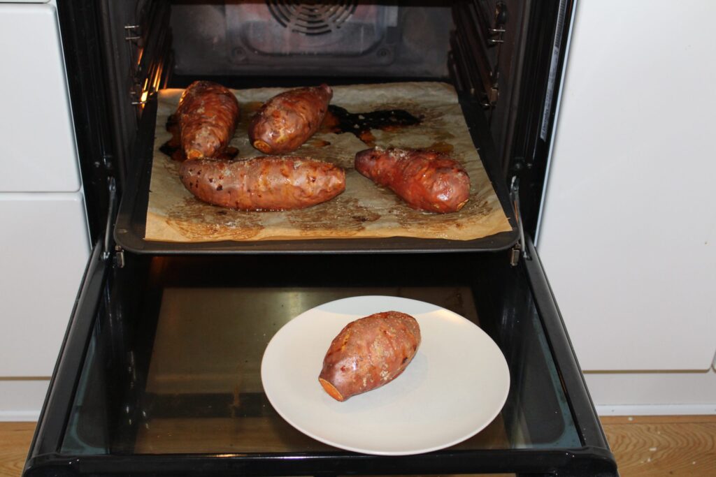 Kartoflerne er bagt hjemmefra og afkølede. Sønnen har mikroovn, hvor de opvarmes før servering. Grønkålssalaten bliver sæsonens sidste. Har selv grønkål i haven. Det er sidste sommers grønkål, der vokser igen, nu hvor det er blevet forår. Men om lidt blomstrer de, og så er det slut.