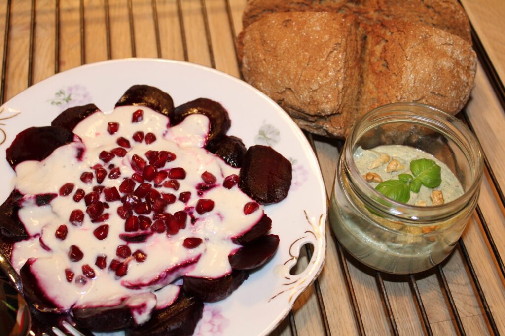 - Skær rødbederne i skiver. Bland peberrod med sojayoghurt, ahornsirup og citronsaft og krydder med salt og peber.