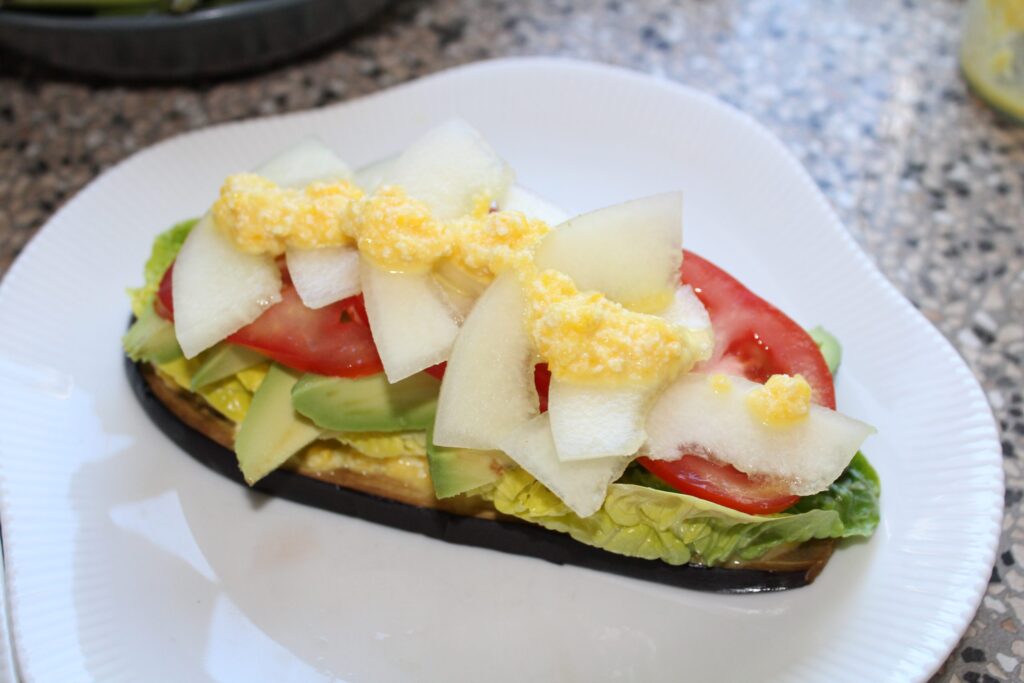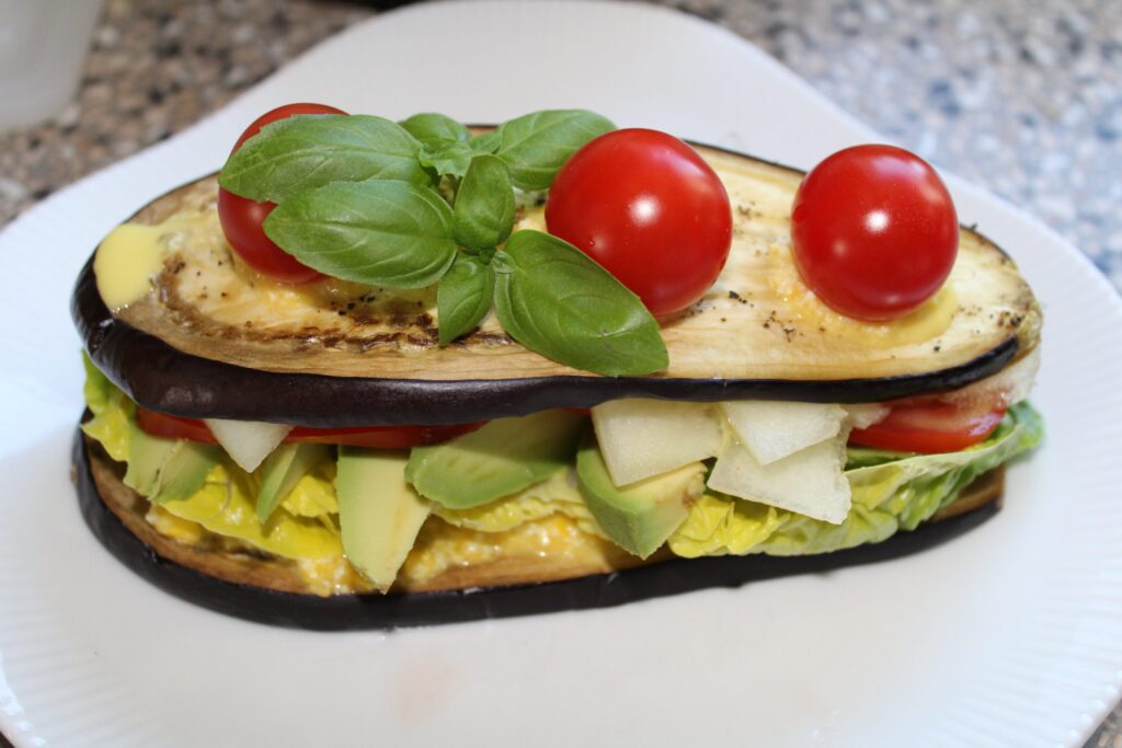- Slut af med en skive bagt aubergine. Pynt evt. sandwichen. Velbekomme.