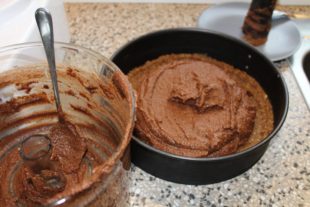 Da jeg fik nærstuderet opskriften, var den selvfølgelig med engelske mål, hvilket satte mig på en længere omregningsproces. Først skulle ingredienslisten omregnes fra måleenheden cups til deciliter. Størrelsen på opskriftens springform var angivet til at måle 6 “. Jeg måtte “google” mig frem til at tegnet ” betyder inches, og at 6 ” er det samme som 15 cm. Men min springfrom måler 25 cm i diameter, og derfor blev jeg nødt til at omregne arealet af en 15 cm springform til arealet af en 25 cm springform med pi, radius og det hele, og at opregne ingredienslistens mål efter en forholdsberegning mellem arealerne af de to forme. Lidt ingeniør er man vel altid, hvis det er vigtigt nok 🙂
