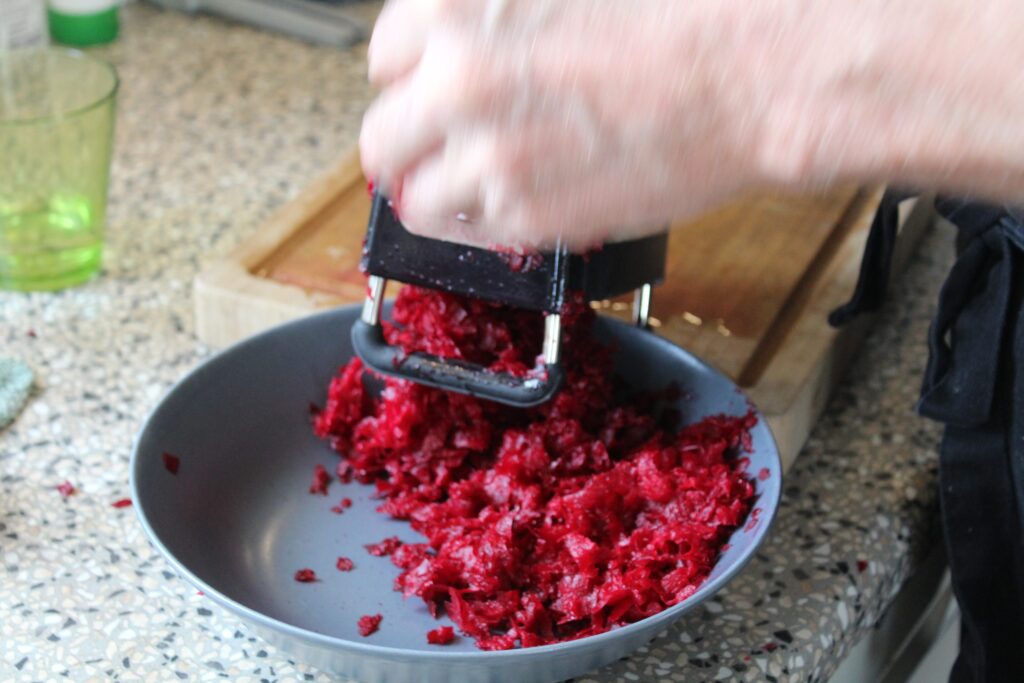 - Rødbeden skrælles, rives fint og røres med i skålen.
